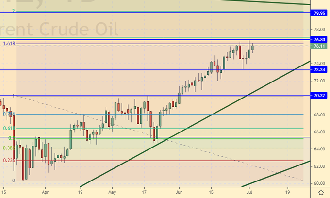 Growth scenario: August futures, the expiration date is July 20. Perhaps touching 76.60, but this is the maximum in this situation. As before, we are outside the market, waiting for a rollback down.