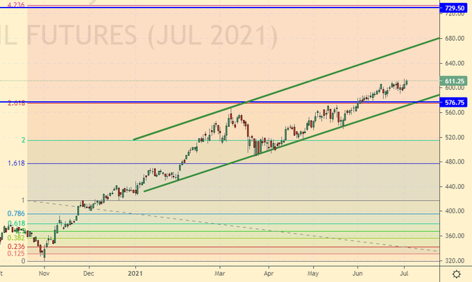 Growth scenario: July futures, expiration date is July 12th. The market remains in a growing channel. We will not buy at current prices. We look forward to a rollback.