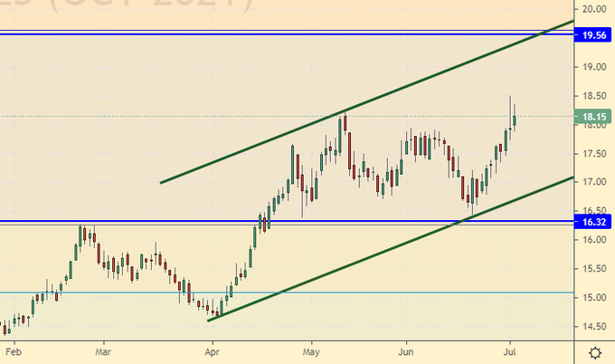 Growth scenario: October futures, the expiration date is September 30. «Here you have to go long, because you don’t want to miss the move to 19.50, » we wrote a week earlier. So far, our purchase is profitable. Let’s wait for the goal to be achieved. Move the stop along the trend.