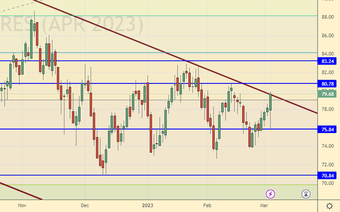 Growth scenario: we are considering the April futures, the expiration date is March 21. If prices rise above 81.50, open long. Until this moment, we remain outside the market.