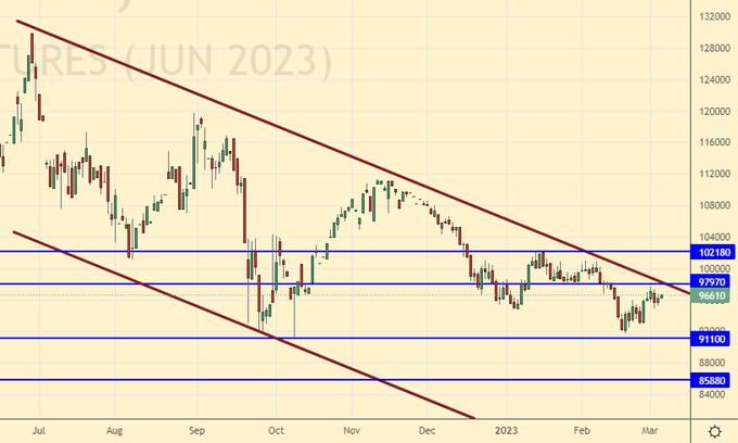 Growth scenario: we are considering the June futures, the expiration date is June 15. We continue to remain in the falling channel. While we are below the level of 100,000, it makes no sense to buy. And even if we rise above this level, it is still worth thinking ten times before taking Russian securities.