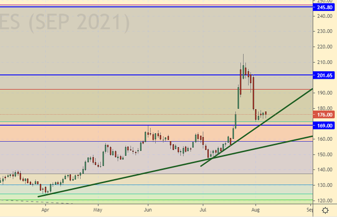 Growth scenario: September futures, expiration date August 27. Gas prices in Europe continue to break records. Moving towards 4.50. We continue to hold longs.