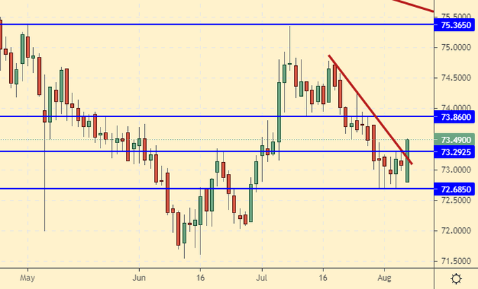 Growth scenario: September futures, the expiration date is August 20. The bulls failed to take the 75.00 area and retreated. Out of the market.