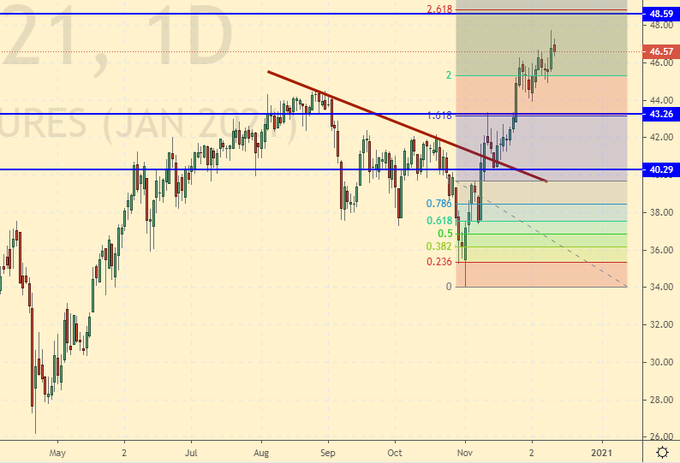 Growth scenario: December futures, expiration date December 31. We don’t see any sense in buying here. From the point of view of technology, there is nowhere to grow further, a pause is needed. From the point of view of fundamental analysis, the positive from the start of vaccination is already in the price.