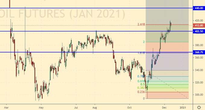 Growth scenario: consider the January futures, expiration date January 12. The market tried to climb above the theoretical level of 412.0, but so far it has failed. In any case, the goals have been achieved, and we see no point in sitting in the position further, counting on a miracle, in the form of a move to 500.0. Another thing is to buy after a rollback to 370.0.