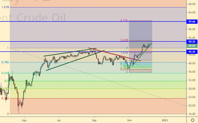 Growth scenario: December futures, expiration date December 31. The goals have been achieved. Those who wish can stand still, but at the same time it is worth tightening stop orders, but for the rest who bought from 42.00, we recommend closing longs. Falling scenario: here we need to sell up to the level of 52.00. We have the right to count on a correction to 45.00.