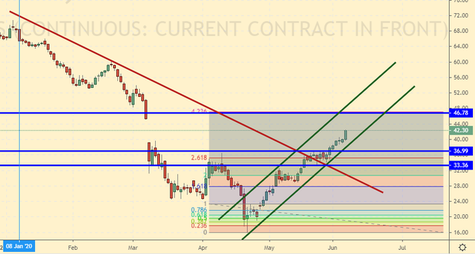 rowth scenario: June futures, the expiration date is 30 June. The market growth will end at the level of 47.00. It is more comfortable to make new purchases on an 1H intervals.