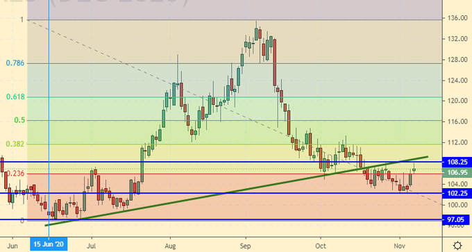 Growth scenario: December futures, expiration date December 18. Buyers supported the market at 102.0, however, we cannot talk about buying yet. We need a price rise above 110.0.