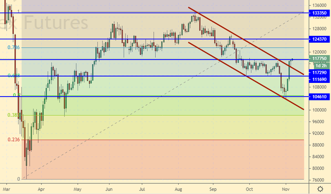 Growth scenario: December futures, expiration date December 14. We hold the current longs, don’t open new positions. Prospects for visiting level 430.0 remain. Stronger growth is not visible in principle. Falling scenario: in general, a sell entry from the current levels is possible, however, due to intelligent maneuvering, it is worth trying to get as high prices as possible while we stay below the level of 418.0. The second option for entering a short is the moment of approaching the level 430.0.