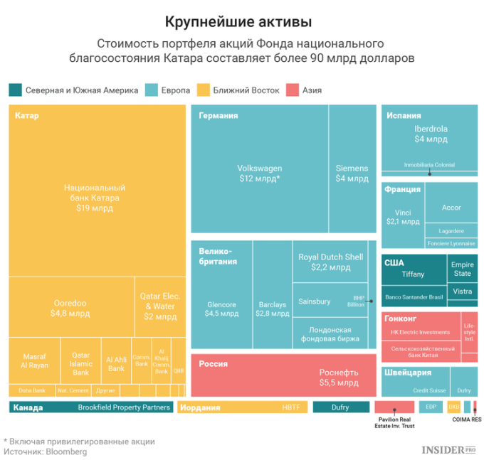 Это касается и Катарского инвестиционного фонда с капиталом 335 млрд долларов — это 14-й по объему суверенный фонд в мире. Среди его активов — голливудские киностудии, офисы в Нью-Йорке, жилье в Лондоне, немецкие автомобили, итальянские рестораны и футбольный клуб «Пари Сен-Жермен».