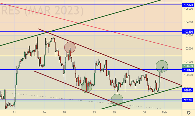 Сбербанк продолжает расти и тащит рынок за уши вверх. При этом, вчера рубль приостановил падение, что и позволило индексу вырасти выше уровня 100000. Здесь можно нарастить лонги. Если всё будет очень хорошо, то мы сможем уйти к уровню 112000.