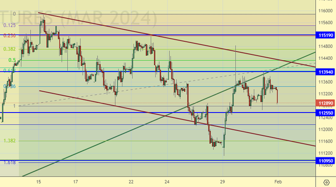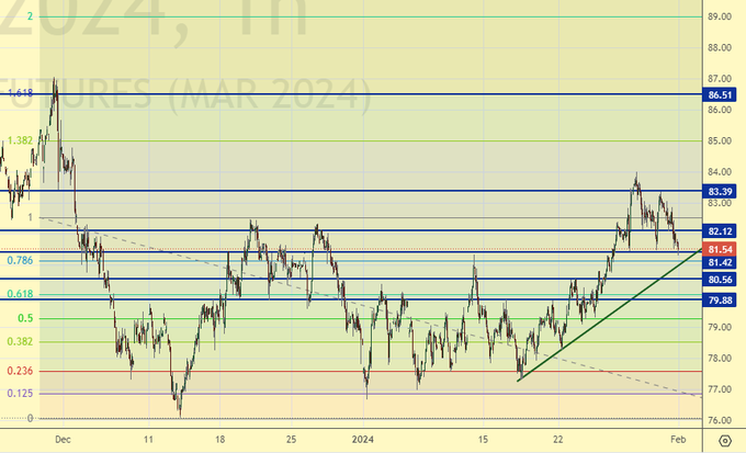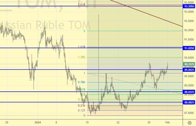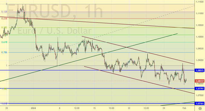 ФРС вчера ставочку оставила на уровне 5.5%. При этом были даны намеки на то, что в марте вряд ли стоит ожидать снижения, а вот позже в этом году вполне возможно. Для доллара спич Пауэлла скорее был поддерживающим нежели ослабляющим его, в результате мы видим некоторую слабость евро, которая может вылиться в ход к 1.0720, а возможно и ниже.