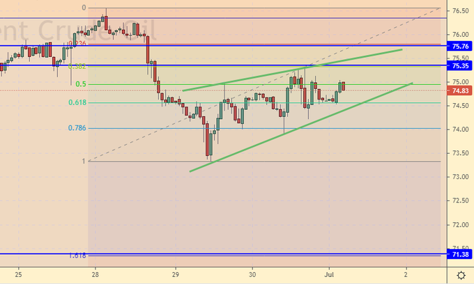 Сегодня вечером в 18:00 Мск. нас ждет заседание ОПЕК+. Технический комитет начнет свою работу раньше, в 16:30. Вероятнее всего рынок отреагирует снижением цен в район 70.50 в случае повышения уровня добычи нефти. Если же увеличения добычи не последует, то мы можем отправиться к 80.00.