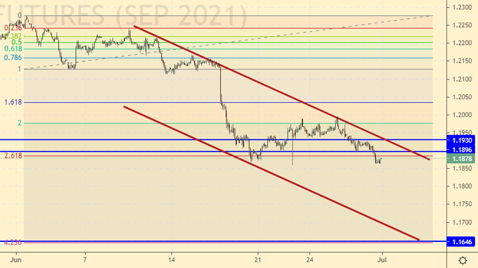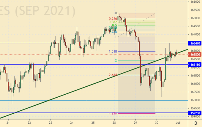 Отличная ситуация для шорта: мы вышли из растущего канала вниз и тестируем его с обратной стороны. Цели на 159000, 155000, и 150000 вполне реальны. Если сегодня ОПЕК+ увеличит добычу, то рубль упадет вслед за нефтью. Этого будет достаточно для движения индекса РТС вниз. Даже не потребуется падения рублевого индекса акции Московской биржи.