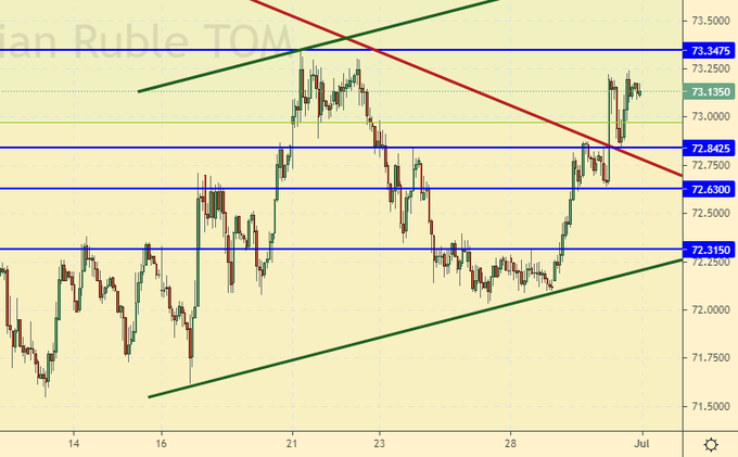 Рубль продолжает падать к доллару и скорее всего тенденция эта сохранится в ближайшие дни. Быки весьма активны и предпосылок для разворота вниз пока нет. Если бы мы вчера удержались ниже 73.00, то у нас были бы шансы на откат к 72.50, сейчас о таком сценарии речь уже не идет.