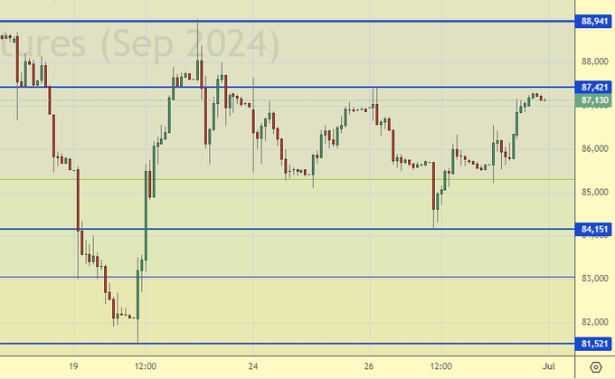 Продажа: нет. Кто в позиции от 89000, держите стоп на 88200. Цель: 75000.