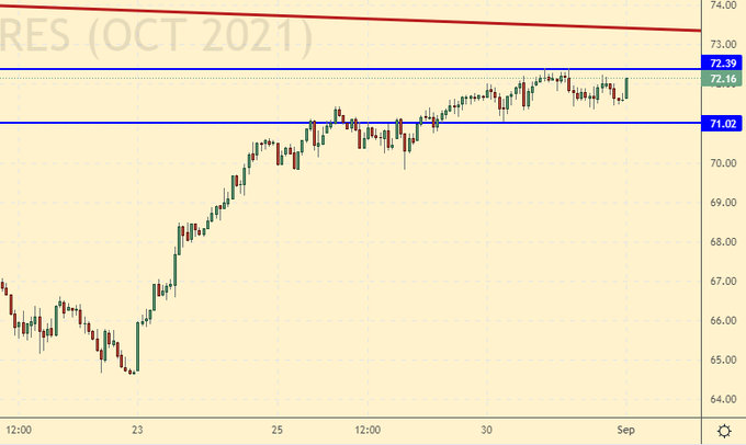 Рынок стоит в узком диапазоне в преддверии заседания ОПЕК+ которое пройдет сегодня. Авторитетные источники, такие как Reuters, заявляют о том, что никаких изменений в текущее соглашение по наращиванию добычи внесено не будет. Если так и получится, то цены вряд ли смогут взять 74.00. Скорее всего мы попробуем снова пройти в район 60.00. Снижение цен усложнит перезапуск проектов по добыче в США и других развитых странах, что должно в конечном счете расширить долю ОПЕК+ на нефтяном рынке.