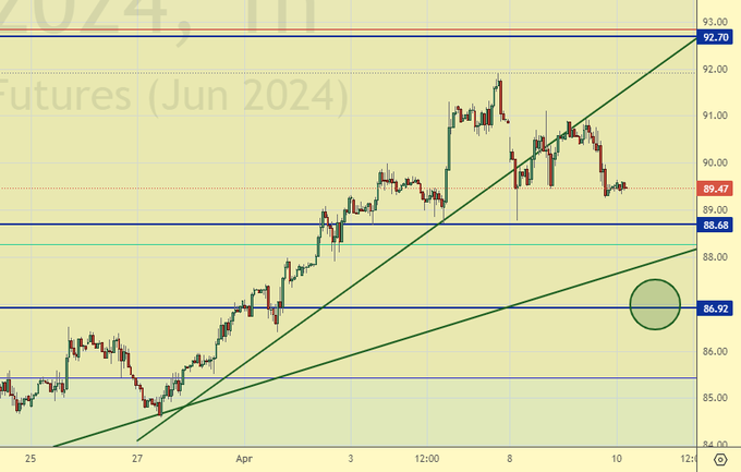 Продажа: при касании 92.70. Стоп: 93.30. Цель: 84.00.