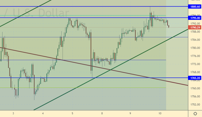 Коснулись 1800 и отошли. В случае дальнейшего роста мы можем быстро увидеть 1830. Сегодня выйдут данные по инфляции, если она замедлится сильнее ожиданий, то нас может ждать продолжение роста на рынке золота.