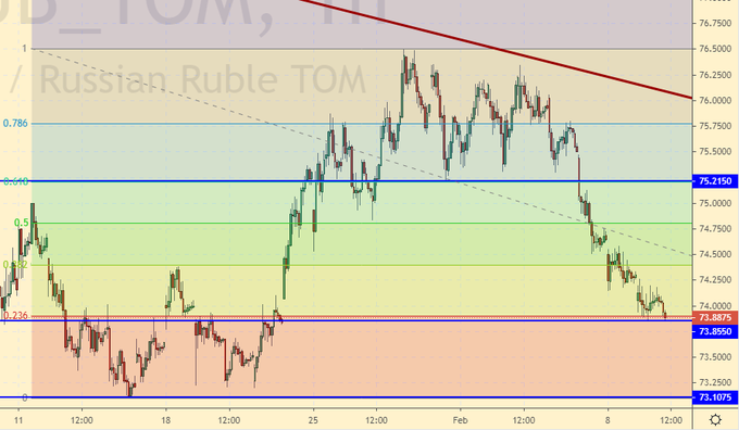 Если очень-очень внимательно рассматривать пару доллар/рубль, именно ТОМ, не обращая внимание на фьючерс, то можно увидеть, что пока, с некоторыми допущениями, уровень поддержки, обозначенный линией Фибо на 73.90, продолжает дышать. Здесь можно побороться за лонг. Слишком больших надежд на разворот вверх не питаем, но если он состоится, то соотношение прибыль/риск по данной сделке будет очень хорошим, так как цели наверху у нас на 81.10.
