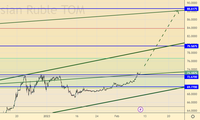 Не видим мы у толпы желания покупать рубль против доллара. Почему? Потому что народ уже с тревогой ждет что-там будет с бюджетом в феврале, при условии, что эти данные появятся в принципе. Кстати, странно, что данные о дефиците в 1.76 трлн. только за январь появились в свободном доступе. Для чего это было сделано? Чтобы легче пройти к 88.00? Возможно.