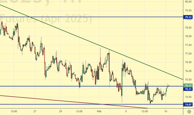 Мы видим, что продавцы высасывают поводы из пальца и пытаются пробиться ниже района 75.00, но у них ничего не получается. Правда, она же матка, состоит в том, что ОПЕК+ не торопится пересматривать своё соглашение, Китай падать не хочет, в США всё просто на хаях. Отметим, что в Европе холодно, идет отбор газа, угля и мазута. Рынок энергоносителей в целом сейчас не склонен к падению.