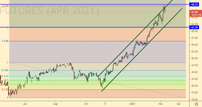Как видим на дневном графике, рынок способен остыть до уровня 61.50 к новому заседанию ОПЕК, которое пройдет уже скоро: 31-го марта и 1-го апреля. Более сильное снижение возможно только в случае плохой макроэкономической ситуации, в первую очередь в Европе, во вторую в Китае.