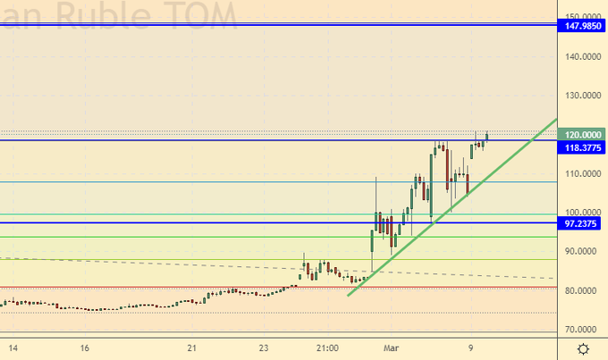 Видим, что рынок замер на 120.00. ЦБ пока жжет резервы, но так как европейцы уже заявили, что альтернативы поставок энергоносителям из России нет, Москве не стоит сильно беспокоиться о том, что валютных поступлений в ближайшем будущем не будет. Нельзя исключать хода к 150.00, но он будет выглядеть как игра спекулянтов. Обрушение валюты в два раза после начала проведения спецоперации на Украине на данный момент обязательным не выглядит.