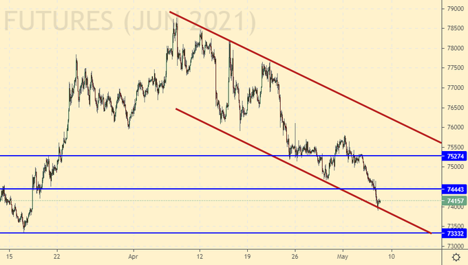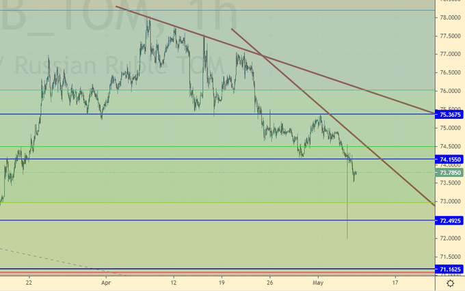 Что точно пока не надо делать, так это покупать доллары. Для покупок наберемся терпения и подождем возврата пары выше 75.00. Второй вариант: подождать падения к 71.20, там и купить. На фьючерсе возможен небольшой лонг с текущих уровней.