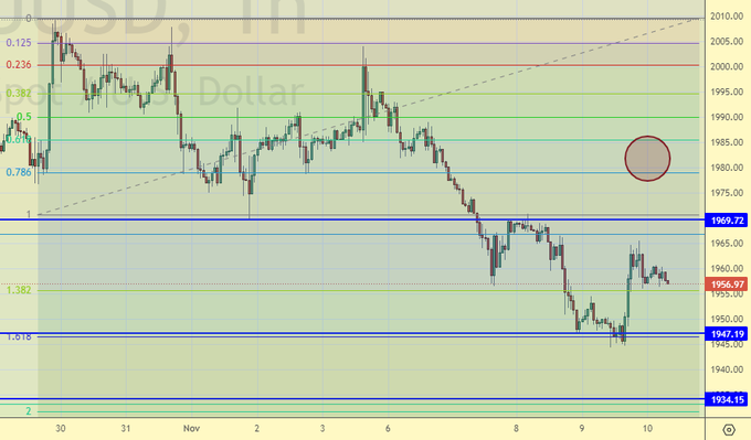 Не смогли пройти выше 1970, что оставляет хорошие шансы на продолжение падения к 1910. Ход ниже района 1900 пока не рассматриваем. Спрос на золото может снизиться из-за необходимости обслуживать более дорогие долги в долларах, которые сейчас набирают корпорации. Можно рассмотреть шорт от 1980.