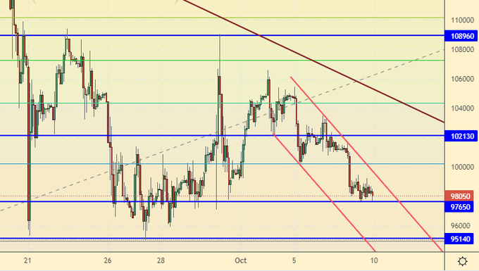 Продажа: в случае падения ниже 97000. Стоп: 104000. Цель: 80000 (50000). Кто вошел от 103500 и 98000, держите стоп на 104000. Цель: 80000 (50000).