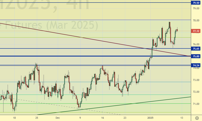 Рынок продолжает стоять выше 75.00, что создает платформу для продолжения роста к 79.50. Для хорошего входа в лонг нужен откат к 74.00. Покупка с текущих уровней выглядит неоптимально.