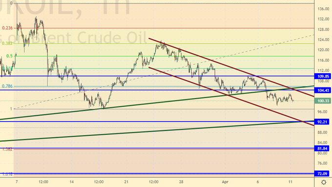 Утром в понедельник видим попытки пробиться ниже 100.00. Вызывает большие сомнения способность продавцов протолкнуть в перспективе рынок ниже 80.00. Начинается автомобильный сезон, это поднимет спрос на бензин. Кроме того, товарные интервенции стран Запада откровенно пугают, так как стратегических резервов в результате таких действий становится всё меньше.