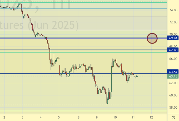 Рынок вряд ли увидит рост даже если США договорятся с Китаем. Мы просто окажемся в ситуации до припадка. Все также будет много нефти и всё также дальнейший рост экономики будет под вопросом. Уже в большей степени чем сейчас. Отсюда, при подходе к 70.00 продавать. Единственное, что поддержит весь рынок товаров, это существенное ослабление доллара. Но это не завтра.
