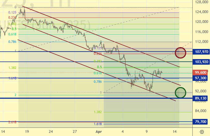 Сохраняем утверждение, что рынок способен отрасти к 108000. Потом будем снова пытаться пройти ниже. Ждать чего-то позитивного пока очень сложно. Однако, если вы ставите на нормализацию ситуации в будущем, то тогда есть смысл покупать бумаги без плеча в портфель в долгую.