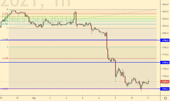 Золото достигло технической цели движения. Здесь можно рассчитывать на возврат к району 1770 после чего ситуация станет менее ясной. Однонаправленного падения в текущих условиях не ждем. Попытки убедить народ в том, что текущий доллар дороже золота могут быть успешными, но долгосрочно такое поведение вряд ли приведет к чему-то хорошему.