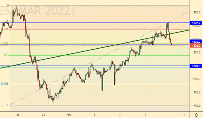 Быкам не удалось пробиться выше 1850. Скорее всего нас ждет падение, которое может перерасти в полномасштабный сброс. Данные по инфляции в США увеличивают шансы на агрессию ФРС в вопросе подъема ставки.