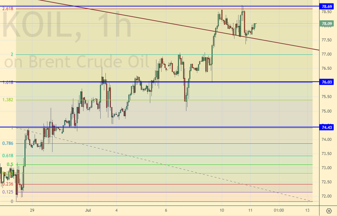 Рынок достиг цели на 78.69. Не исключен откат к 76.00, возможно к 74.50, после чего быки попытаются пройти выше 80.00. Если данные за второй квартал покажут спад мирового ВВП, то это может привести к всеобщему расстройству психики, после чего цены начнут падать без оглядки на то, как там себя будет обрезать ОПЕК+.