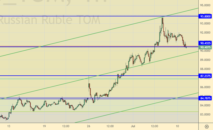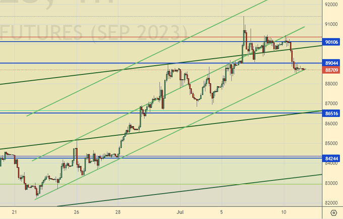 Видим развитие дежурной коррекции, которая вряд ли станет глубокой. Если котировки упадут до 87.00, то надо будет купить. Пока предлагаем посмотреть за развитием событий со стороны.