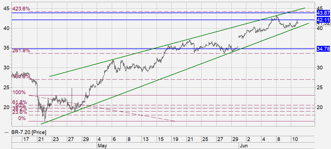 Продажа: при подходе к 43.80. Стоп: 45.30. Цель: 35.20. Кто вошел от 43.40, держите стоп на 45.30. Цель: 35.20. Можно продать в случае падения цен ниже 40.00. Стоп: 40.60. Цель: 30.00.