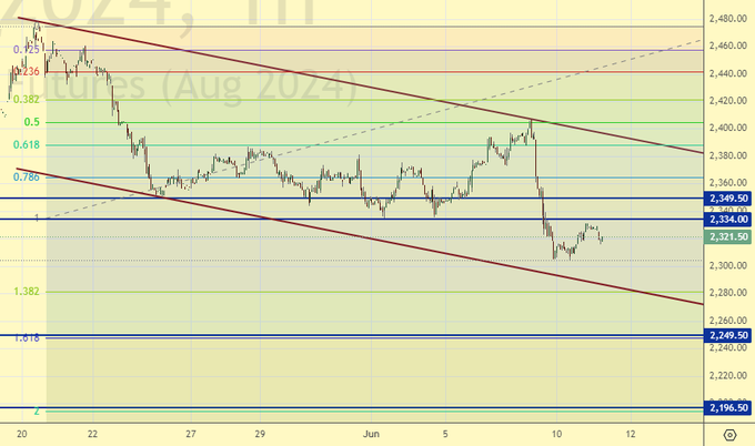 Пока политики не делают резких заявлений у золота не будет причин для укрепления. В общем и целом, мы ждем заседания ФРС, после чего в зависимости от прогнозов по силе доллара, можно будет строить какие-то прогнозы на пару недель вперед. Пока, при спокойном развитии событий, мы должны продолжить падение.