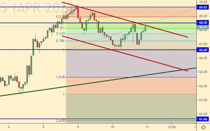 Продажа: при подходе к 69.00. Стоп: 69.70. Цель: 61.60. Кто вошел от 69.30, перенесите стоп на 69.70. Цель: 61.60.