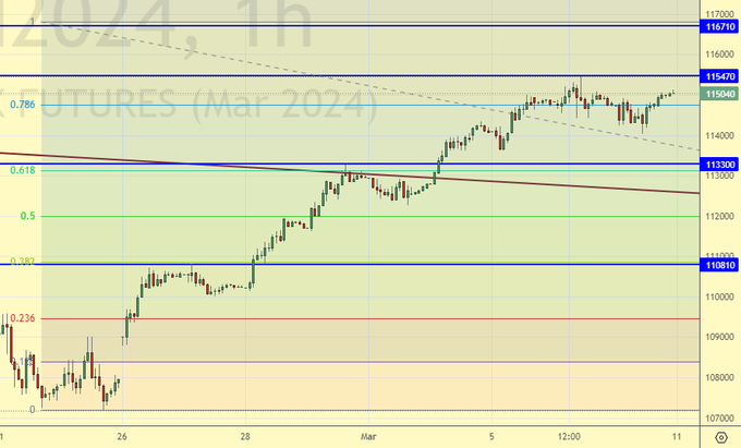 А уровень 115000 оказался для быков не таким и легким. Мы пока не можем преодолеть его и закрепиться выше, что оставляет шансы на откат. Учитывая укрепление рубля и продолжающийся бычий настрой на российском фондовом рынке можно предполагать продолжение роста по индексу РТС.