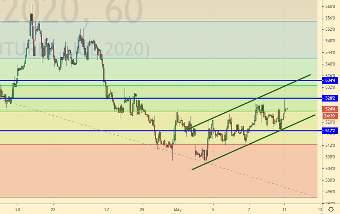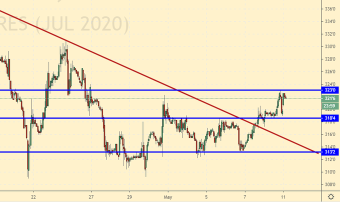 Рынок пытается расти. Всё сообщество ждет вторника и выхода данных USDA в 19.00 Мск. Движение вверх представляется наиболее вероятным сценарием. Кроме самого прогноза по урожаю в цену нужно заложить и риски по сбору и перевалке зерна в новом сезоне в условиях карантина.