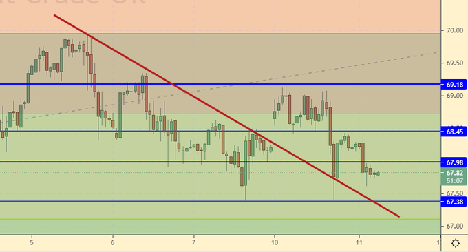 На рынке неопределенность. Продолжим ждать касания 67.30. Если это произойдет, будем продавать. Вчерашнее падение с точки зрения продавцов смотрится неплохо, но нам требуется подтверждение.