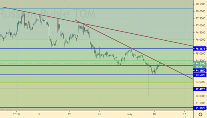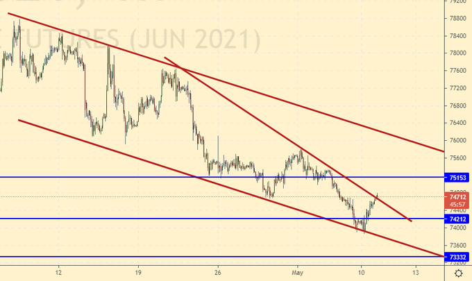 Продажа: сейчас и при откате к 74.50. Стоп: 74.80. Цель: 71.20.