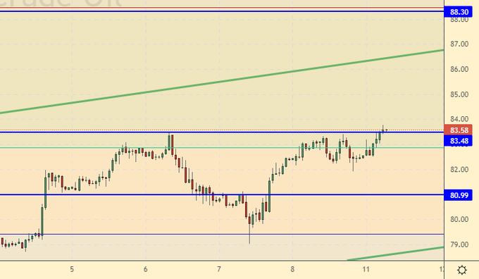 Мы продолжаем упрямо лезть наверх к отметке 88.00. Это неплохо. Скорее всего, коррекции к 80.00 мы так и не увидим, а значит, можно рассчитывать, что к концу текущей недели рынок достигнет максимума и начнется полноценный откат. Разговоры о нефти по 100 долларов за бочку, конечно, вызывают эмоции, но пока мы не склонны на столько драматизировать ситуацию.