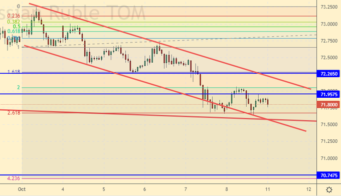 Утром понедельника пара настроена на падение. Это не удивительно, так как нефть продолжает расти. Если мы останемся до конца года на текущих уровнях по нефти, то не исключено, что бюджет России не будет дефицитным, что позитивно для рубля. Пока держим шорты. Мечтаем об отметке 70.70.