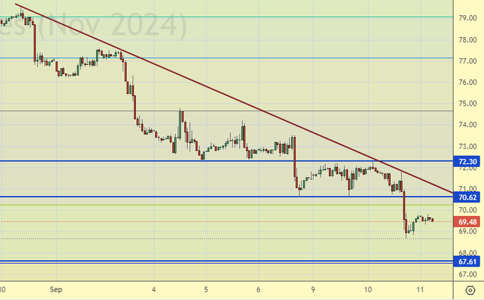 Мы упали ниже 70.00 и путь к 60.00, более того, к 56.00 у нас открыт. Стоит воспользоваться возможными подъемами для продаж. Что-то подсказывает, глядя на поток новостей, что текущее падение не связано только с рынком нефти напрямую. Если внутри арабских стран будет посеян страх о «доле рынка», и начнется массовая добыча, то при текущих мощностях, мы не только минус 40 по нефти увидим, как это было 21 апреля 2020-го года, но и минус 100 долларов за баррель.