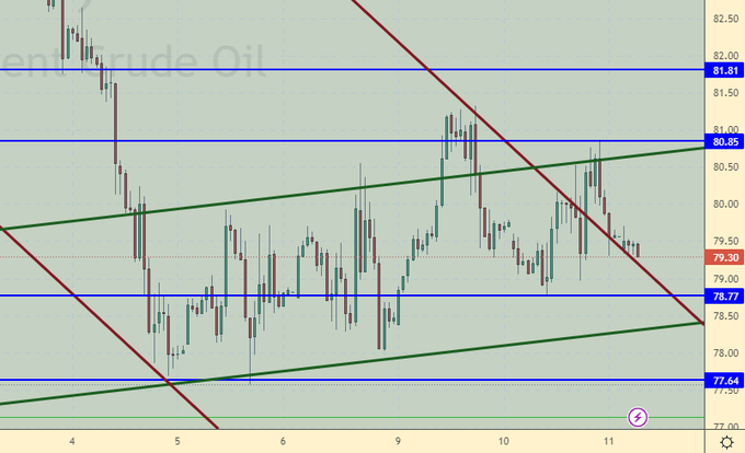Согласно данным API коммерческие запасы нефти в США выросли за неделю на 14.865 млн. баррелей. Цифра на самом деле гигантская, но рынок пока не слишком ярко реагирует на неё. Однако, если сегодня и EIA выдаст что-то соизмеримое, то вряд ли котировки удержатся на текущих уровнях. Как минимум будет предпринята попытка пройти ниже 78.00. Если она завершится успехом, то последует более глубокое падение в район 70.00.